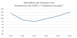 Postalische Empfängeradressen haben in der Vergangenheit in der Kundenkommunikation an Bedeutung verloren, spielen aber vermehrt eine Rolle, da der Onlinehandel diese zwingend benötigt. Wer seine Bestände in der Schweiz mit Dienstleistungen der Schweizer Post pflegt (MatchMove oder Webservices) verliert pro Jahr ca. 10% der gültigen Adressen durch Umzug. Das obige Beispiel aus dem Handel zeigt das deutlich auf. So ist der prozentuale Anteil erst gesunken steigt aber seit 2017 wieder an auf bis zu 15 %.