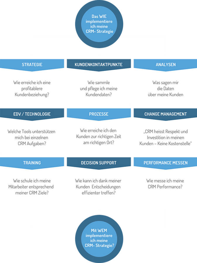 Es gibt nach unserer Projekterfahrung 9 Bereiche, die in einem ein CRM-Projekt berücksichtigt werden müssen. Die IT-Frage nach der richtigen Software ist nur ein Bereich. Was will ich messen, mit welchen Kunden möchte ich Dialog führen, welche Mitarbeiter muss ich schulen, wie möchte ich das Projekt und dessen Erfolg messen, sind nur einige Fragestellungen, die in dem Projekt auftauchen.
