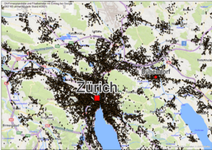 Was passiert, wenn man die Adressdaten von „aktiven“ Firmen auf eine CH Karte legt, sieht man hier schön am Raum Zürich. Jeder Punkt eine Firma bzw. ein Retailstandort, ob Firmen, Kiosk, Lebensmittelhandel, Tankstelle oder Hotel. Interessant ist sicherlich nicht nur die Bündelung, sondern auch die Menge der Punkte. Wir haben etwa 564’000 solcher Standorte in unserer Firmen-DB. Dabei interessiert uns hier nicht zwingend der Branchencode, sondern, ob diese eine #digitalePräsenz auf Google Maps habe, also in der Google Suche auftauchen.